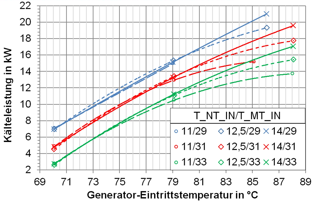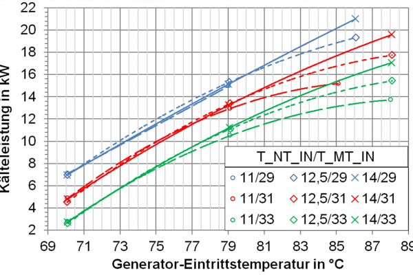 Anschließend wurde die Software für komplette Systeme zur solaren Kühlung und für die Kraft-Wärme-Kälte-Kopplung validiert. Hierbei wurden die bereits zuvor einzeln validierten Komponentenmodelle zu einem System verschaltet und mit den notwendigen Hydrauliken und Regelungsalgorithmen ausgestattet. Mit der so entstandenen Software können nun vielfältige innovative Kühltechnologien simuliert werden.