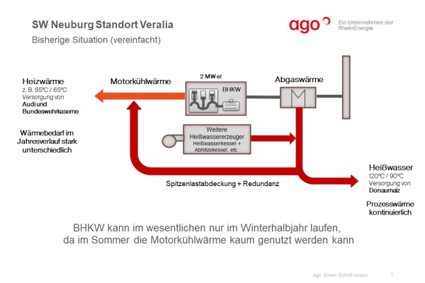Die Hochtemperaturwärmepumpe wurde bei den Stadtwerken Neuburg installiert. Diese betreiben ein Blockheizkraftwerk (BHKW), dessen Motorkühlwärme ein Fernwärmenetz speist und dessen Abgaswärme zur Heißwassererzeugung bis 140 Grad Celsius genutzt wird. Eine benachbarte Mälzerei benötigt dieses Heißwasser ganzjährig. In den Sommermonaten lohnte sich der Betrieb des BHWK jedoch bisher nicht, da der Bedarf des Fernwärmenetzes dann geringer ist. Dies hat sich nun durch den Einsatz der Hochtemperaturwärmepumpe geändert. Sie hebt die Motorkühlwärme des BHKW auf die Heißwassertemperatur an, so dass die Mälzerei ganzjährig versorgt werden kann. Im Winter speist der Rücklauf des Heißwassernetzes wiederum das Fernwärmenetz.