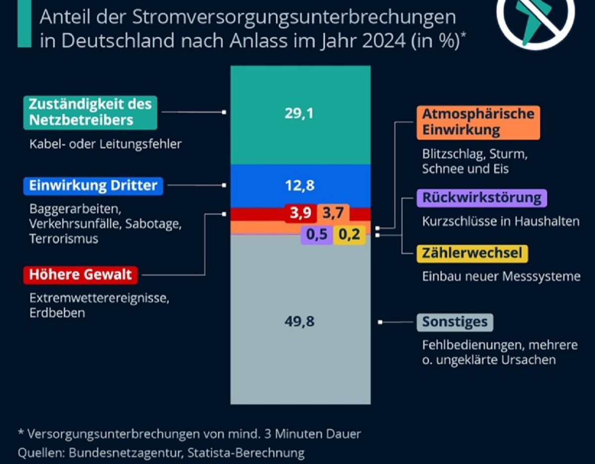 Die Ursachen für Ausfälle sind vielfältig. Knapp die Hälfte zählen zu den sonstigen Anlässen, etwa Fehlbedienungen der Strominfrastruktur oder ungeklärte Ursachen. Am zweithäufigsten sind nach Angaben der Bundesnetzagentur Ausfälle, die in den Zuständigkeitsbereich der Netzbetreiber fallen, wie Kabel- oder Leitungsfehler. Danach folgen Einwirkungen Dritter. Das können Baggerarbeiten oder Verkehrsunfälle sein, aber auch Sabotageakte und terroristische Anschläge. Hierzu zählt auch der großflächige Stromausfall in Berlin Anfang 2026.