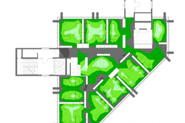 The second of the two demonstration properties is a student study hall at the Technical University of Braunschweig. The focus of the system design in this particular case was daylight-dependent brightness regulation with automatic activation/deactivation. The researchers hoped to establish an energy and comfort-efficient lighting concept in the course of the project in compliance with the German Energy Saving Ordinance and the German Ordinance on Workplaces. Using networked light sensors and motion detectors, a reduction in consumption of approx. 60% can be achieved through the digital control of lighting (DALI - Digital Addressable Lighting Interface) at the 39 workstations, and the surface area-specific energy requirements of less than 14 W/m² defined in the EnEV achieved.