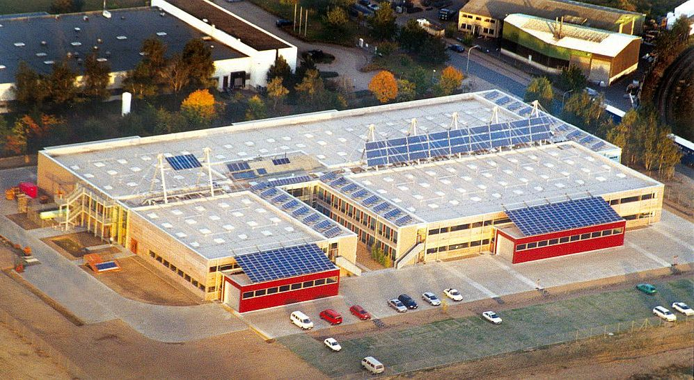 The new-build scheme housing the production and administration facilities for one of Germany's leading solar companies relies on 100 % renewable energy sources. Consistently planned to save energy, the heat requirement of 23 kWh/m² p.a. is 80 per cent below the requirements stipulated at that time for conventional industrial new-build schemes by the 1995 German Heat Insulation Ordinance (WSchV 95). The remaining primary energy requirement is met by combining solar power and biomass as energy sources. This enables a “zero-emission factory” to be realised in the annual balance. The building has been awarded numerous prizes.